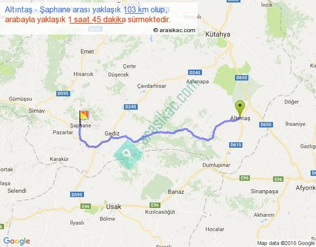 Altıntaş - Şaphane arası yaklaşık olarak 90 km/h ile yukarıda belirtilen sürede olup, iki yerin kuş uçuşu uzaklığı (mesafesi) 76'dir. Yolculuk otobüsle 2 saat 16 dakika sürmektedir.