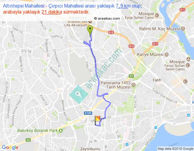 Altıntepsi Mahallesi - Çırpıcı Mahallesi arası yaklaşık olarak 90 km/h ile yukarıda belirtilen sürede olup, iki yerin kuş uçuşu uzaklığı (mesafesi) 4'dir. Yolculuk otobüsle 27 dakika sürmektedir.