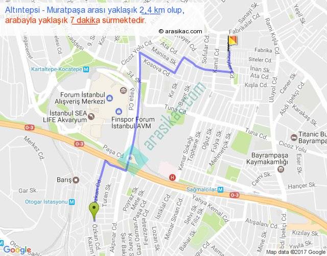 Altıntepsi - Muratpaşa arası yaklaşık olarak 90 km/h ile yukarıda belirtilen sürede olup, iki yerin kuş uçuşu uzaklığı (mesafesi) 2'dir. Yolculuk otobüsle 9 dakika sürmektedir.
