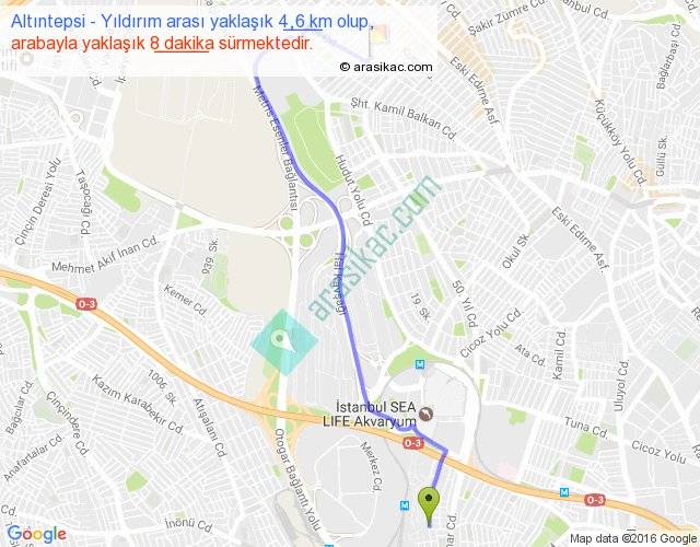 Altıntepsi - Yıldırım arası yaklaşık olarak 90 km/h ile yukarıda belirtilen sürede olup, iki yerin kuş uçuşu uzaklığı (mesafesi) 3'dir. Yolculuk otobüsle 10 dakika sürmektedir.