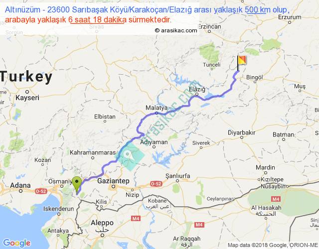 Altınüzüm - 23600 Sarıbaşak Köyü Karakoçan Elazığ arası yaklaşık olarak 90 km/h ile yukarıda belirtilen sürede olup, iki yerin kuş uçuşu uzaklığı (mesafesi) 390'dir. Eğer belirtilen yerler arasında uçak seferi var ise bu süre uçakla 36 dakika'ya kadar düşebilir. Yolculuk otobüsle 8 saat 11 dakika sürmektedir.