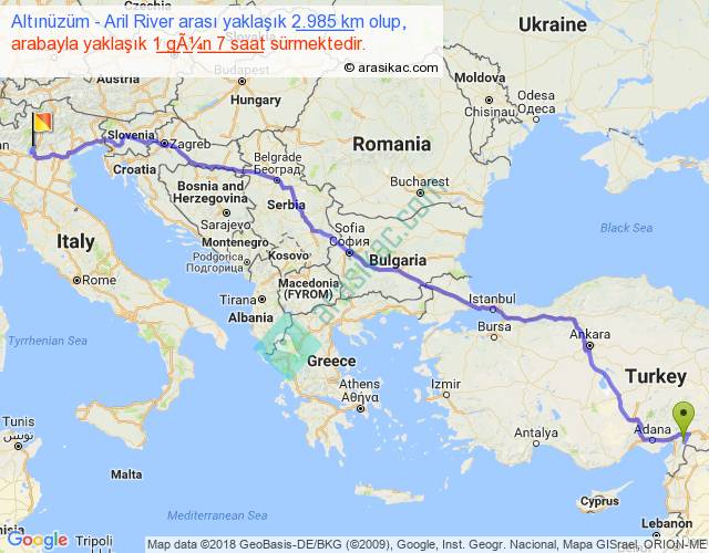 Altınüzüm - Aril River arası yaklaşık olarak 90 km/h ile yukarıda belirtilen sürede olup, iki yerin kuş uçuşu uzaklığı (mesafesi) 2337'dir. Eğer belirtilen yerler arasında uçak seferi var ise bu süre uçakla 3 saat 35 dakika'ya kadar düşebilir. Yolculuk otobüsle 1 gün 16 saat sürmektedir.
