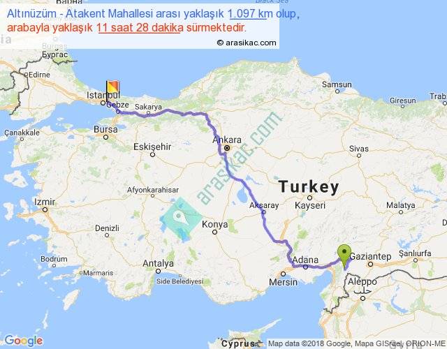 Altınüzüm - Atakent Mahallesi arası yaklaşık olarak 90 km/h ile yukarıda belirtilen sürede olup, iki yerin kuş uçuşu uzaklığı (mesafesi) 784'dir. Eğer belirtilen yerler arasında uçak seferi var ise bu süre uçakla 1 saat 12 dakika'ya kadar düşebilir. Yolculuk otobüsle 14 saat 54 dakika sürmektedir.