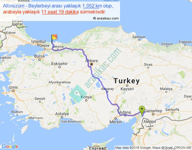 Altınüzüm - Beylerbeyi arası yaklaşık olarak 90 km/h ile yukarıda belirtilen sürede olup, iki yerin kuş uçuşu uzaklığı (mesafesi) 727'dir. Eğer belirtilen yerler arasında uçak seferi var ise bu süre uçakla 1 saat 07 dakika'ya kadar düşebilir. Yolculuk otobüsle 14 saat 42 dakika sürmektedir.