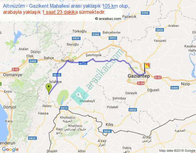 Altınüzüm - Gazikent Mahallesi arası yaklaşık olarak 90 km/h ile yukarıda belirtilen sürede olup, iki yerin kuş uçuşu uzaklığı (mesafesi) 78'dir. Yolculuk otobüsle 1 saat 47 dakika sürmektedir.