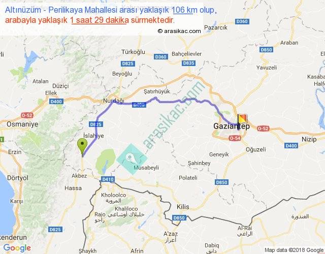 Altınüzüm - Perilikaya Mahallesi arası yaklaşık olarak 90 km/h ile yukarıda belirtilen sürede olup, iki yerin kuş uçuşu uzaklığı (mesafesi) 76'dir. Yolculuk otobüsle 1 saat 55 dakika sürmektedir.