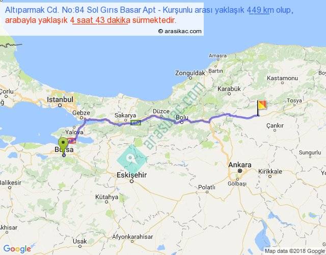 Altıparmak Cd. No:84 Sol Gırıs Basar Apt - Kurşunlu arası yaklaşık olarak 90 km/h ile yukarıda belirtilen sürede olup, iki yerin kuş uçuşu uzaklığı (mesafesi) 361'dir. Eğer belirtilen yerler arasında uçak seferi var ise bu süre uçakla 33 dakika'ya kadar düşebilir. Yolculuk otobüsle 6 saat 7 dakika sürmektedir.