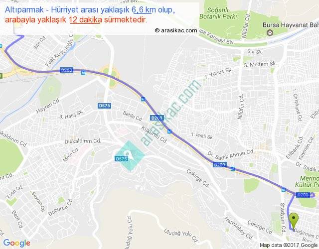 Altıparmak - Hürriyet arası yaklaşık olarak 90 km/h ile yukarıda belirtilen sürede olup, iki yerin kuş uçuşu uzaklığı (mesafesi) 5'dir. Yolculuk otobüsle 15 dakika sürmektedir.