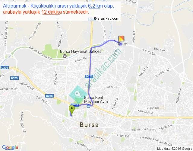 Altıparmak - Küçükbalıklı arası yaklaşık olarak 90 km/h ile yukarıda belirtilen sürede olup, iki yerin kuş uçuşu uzaklığı (mesafesi) 4'dir. Yolculuk otobüsle 15 dakika sürmektedir.