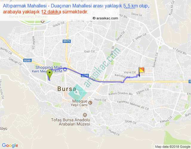 Altıparmak Mahallesi - Duaçınarı Mahallesi arası yaklaşık olarak 90 km/h ile yukarıda belirtilen sürede olup, iki yerin kuş uçuşu uzaklığı (mesafesi) 4'dir. Yolculuk otobüsle 15 dakika sürmektedir.