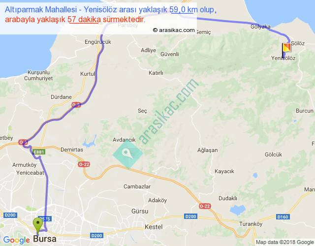 Altıparmak Mahallesi - Yenisölöz arası yaklaşık olarak 90 km/h ile yukarıda belirtilen sürede olup, iki yerin kuş uçuşu uzaklığı (mesafesi) 36'dir. Yolculuk otobüsle 1 saat 14 dakika sürmektedir.