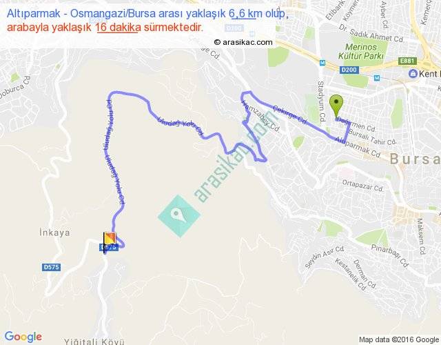 Altıparmak - Osmangazi Bursa arası yaklaşık olarak 90 km/h ile yukarıda belirtilen sürede olup, iki yerin kuş uçuşu uzaklığı (mesafesi) 3'dir. Yolculuk otobüsle 20 dakika sürmektedir.