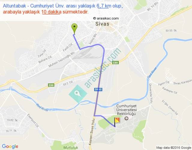 Altuntabak - Cumhuriyet Ünv. arası yaklaşık olarak 90 km/h ile yukarıda belirtilen sürede olup, iki yerin kuş uçuşu uzaklığı (mesafesi) 5'dir. Yolculuk otobüsle 13 dakika sürmektedir.