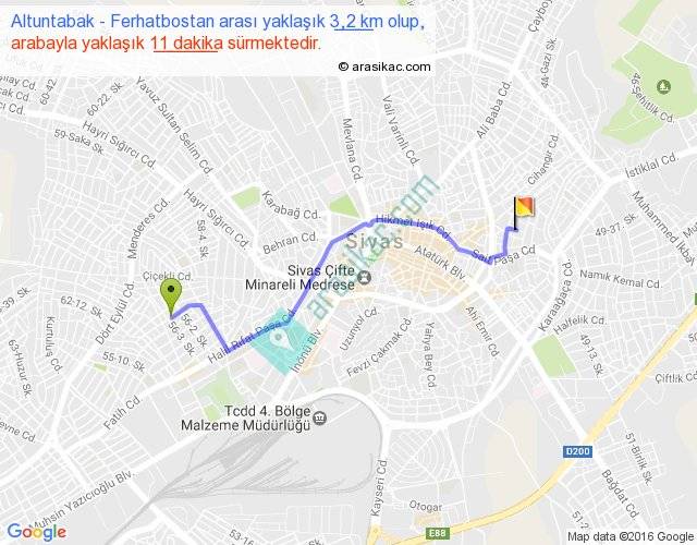 Altuntabak - Ferhatbostan arası yaklaşık olarak 90 km/h ile yukarıda belirtilen sürede olup, iki yerin kuş uçuşu uzaklığı (mesafesi) 2'dir. Yolculuk otobüsle 14 dakika sürmektedir.