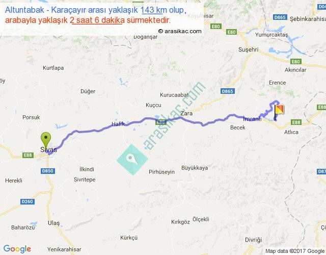 Altuntabak - Karaçayır arası yaklaşık olarak 90 km/h ile yukarıda belirtilen sürede olup, iki yerin kuş uçuşu uzaklığı (mesafesi) 106'dir. Yolculuk otobüsle 2 saat 43 dakika sürmektedir.