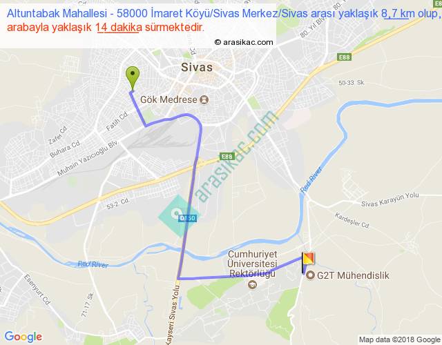 Altuntabak Mahallesi - 58000 İmaret Köyü Sivas Merkez Sivas arası yaklaşık olarak 90 km/h ile yukarıda belirtilen sürede olup, iki yerin kuş uçuşu uzaklığı (mesafesi) 5'dir. Yolculuk otobüsle 18 dakika sürmektedir.