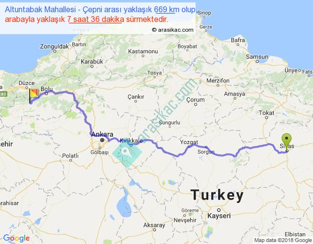 Altuntabak Mahallesi - Çepni arası yaklaşık olarak 90 km/h ile yukarıda belirtilen sürede olup, iki yerin kuş uçuşu uzaklığı (mesafesi) 494'dir. Eğer belirtilen yerler arasında uçak seferi var ise bu süre uçakla 45 dakika'ya kadar düşebilir. Yolculuk otobüsle 9 saat 52 dakika sürmektedir.