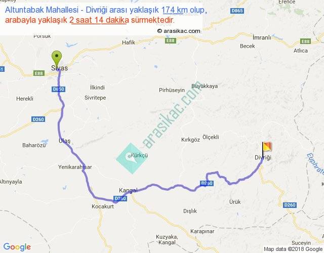 Altuntabak Mahallesi - Divriği arası yaklaşık olarak 90 km/h ile yukarıda belirtilen sürede olup, iki yerin kuş uçuşu uzaklığı (mesafesi) 104'dir. Yolculuk otobüsle 2 saat 54 dakika sürmektedir.