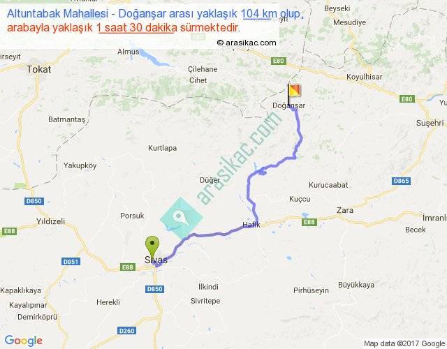 Altuntabak Mahallesi - Doğanşar arası yaklaşık olarak 90 km/h ile yukarıda belirtilen sürede olup, iki yerin kuş uçuşu uzaklığı (mesafesi) 69'dir. Yolculuk otobüsle 1 saat 57 dakika sürmektedir.