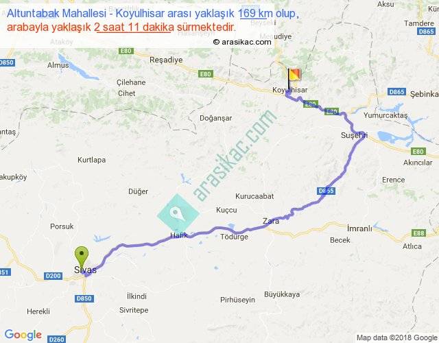Altuntabak Mahallesi - Koyulhisar arası yaklaşık olarak 90 km/h ile yukarıda belirtilen sürede olup, iki yerin kuş uçuşu uzaklığı (mesafesi) 94'dir. Yolculuk otobüsle 2 saat 50 dakika sürmektedir.