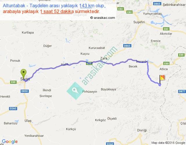 Altuntabak - Taşdelen arası yaklaşık olarak 90 km/h ile yukarıda belirtilen sürede olup, iki yerin kuş uçuşu uzaklığı (mesafesi) 110'dir. Yolculuk otobüsle 2 saat 25 dakika sürmektedir.