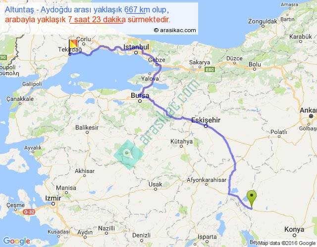 Altuntaş - Aydoğdu arası yaklaşık olarak 90 km/h ile yukarıda belirtilen sürede olup, iki yerin kuş uçuşu uzaklığı (mesafesi) 450'dir. Eğer belirtilen yerler arasında uçak seferi var ise bu süre uçakla 41 dakika'ya kadar düşebilir. Yolculuk otobüsle 9 saat 35 dakika sürmektedir.