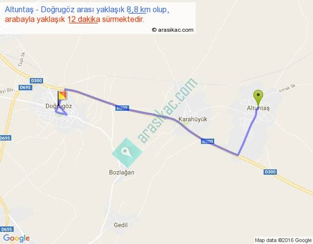 Altuntaş - Doğrugöz arası yaklaşık olarak 90 km/h ile yukarıda belirtilen sürede olup, iki yerin kuş uçuşu uzaklığı (mesafesi) 6'dir. Yolculuk otobüsle 15 dakika sürmektedir.