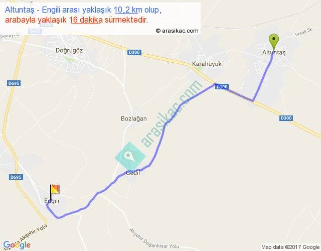 Altuntaş - Engili arası yaklaşık olarak 90 km/h ile yukarıda belirtilen sürede olup, iki yerin kuş uçuşu uzaklığı (mesafesi) 8'dir. Yolculuk otobüsle 20 dakika sürmektedir.