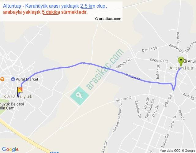 Altuntaş - Karahüyük arası yaklaşık olarak 90 km/h ile yukarıda belirtilen sürede olup, iki yerin kuş uçuşu uzaklığı (mesafesi) 2'dir. Yolculuk otobüsle 6 dakika sürmektedir.