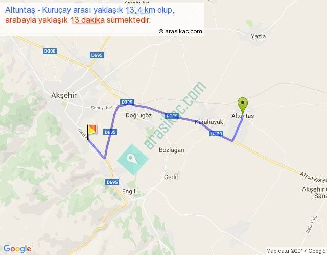 Altuntaş - Kuruçay arası yaklaşık olarak 90 km/h ile yukarıda belirtilen sürede olup, iki yerin kuş uçuşu uzaklığı (mesafesi) 9'dir. Yolculuk otobüsle 16 dakika sürmektedir.