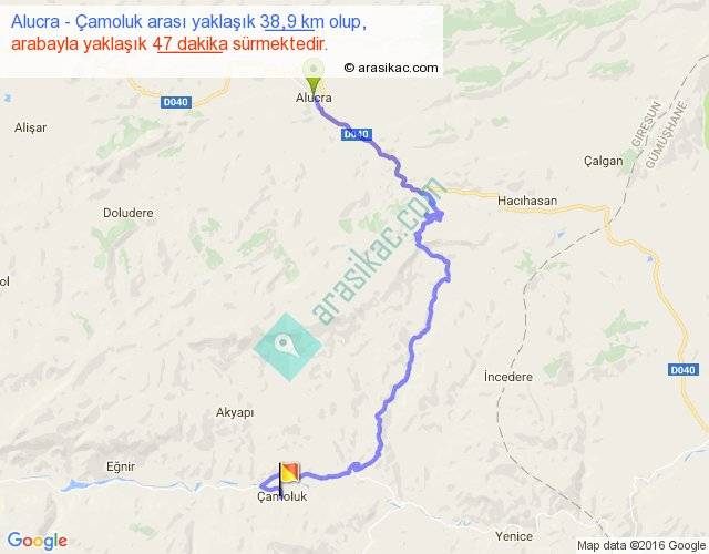 Alucra - Çamoluk arası yaklaşık olarak 90 km/h ile yukarıda belirtilen sürede olup, iki yerin kuş uçuşu uzaklığı (mesafesi) 21'dir. Yolculuk otobüsle 1 saat 1 dakika sürmektedir.