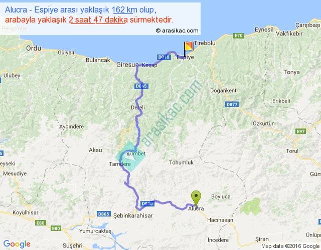 Eğer Alucra Espiye arası ne kadar yakar (benzin/mazot) diyorsanız, kilometrede 3 ₺ yakan bir aracınız var ise 486, km'de 4 ₺ yakan bir aracınız var ise 648, km'de 5 ₺ yakan bir aracınız var ise 810 ile bu yolculuğu tamamlayabilirsiniz.