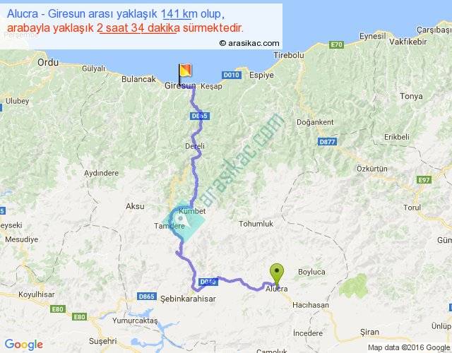 Eğer Alucra Giresun arası ne kadar yakar (benzin/mazot) diyorsanız, kilometrede 3 ₺ yakan bir aracınız var ise 423, km'de 4 ₺ yakan bir aracınız var ise 564, km'de 5 ₺ yakan bir aracınız var ise 705 ile bu yolculuğu tamamlayabilirsiniz.