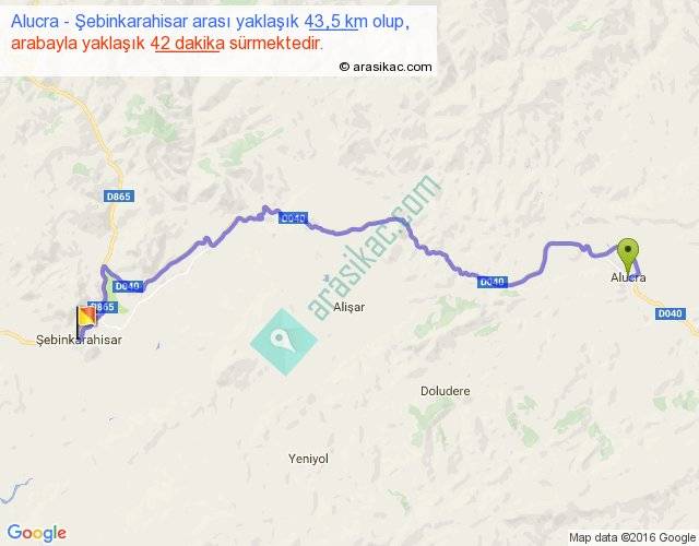 Alucra - Şebinkarahisar arası yaklaşık olarak 90 km/h ile yukarıda belirtilen sürede olup, iki yerin kuş uçuşu uzaklığı (mesafesi) 29'dir. Yolculuk otobüsle 54 dakika sürmektedir.