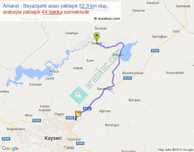 Amarat - Beyazşehir arası yaklaşık olarak 90 km/h ile yukarıda belirtilen sürede olup, iki yerin kuş uçuşu uzaklığı (mesafesi) 31'dir. Yolculuk otobüsle 57 dakika sürmektedir.