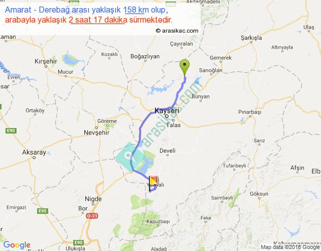 Amarat - Derebağ arası yaklaşık olarak 90 km/h ile yukarıda belirtilen sürede olup, iki yerin kuş uçuşu uzaklığı (mesafesi) 113'dir. Yolculuk otobüsle 2 saat 58 dakika sürmektedir.
