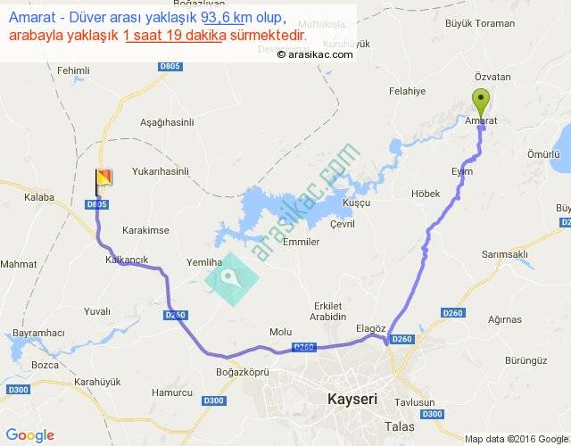 Amarat - Düver arası yaklaşık olarak 90 km/h ile yukarıda belirtilen sürede olup, iki yerin kuş uçuşu uzaklığı (mesafesi) 52'dir. Yolculuk otobüsle 1 saat 42 dakika sürmektedir.