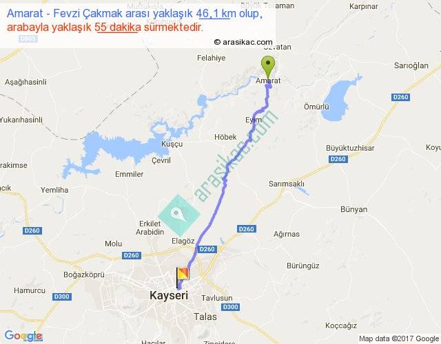 Amarat - Fevzi Çakmak arası yaklaşık olarak 90 km/h ile yukarıda belirtilen sürede olup, iki yerin kuş uçuşu uzaklığı (mesafesi) 39'dir. Yolculuk otobüsle 1 saat 11 dakika sürmektedir.