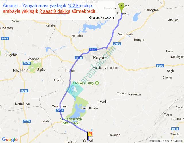 Amarat - Yahyalı arası yaklaşık olarak 90 km/h ile yukarıda belirtilen sürede olup, iki yerin kuş uçuşu uzaklığı (mesafesi) 109'dir. Yolculuk otobüsle 2 saat 47 dakika sürmektedir.