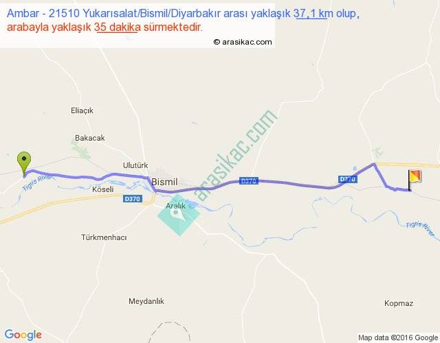 Ambar - 21510 Yukarısalat Bismil Diyarbakır arası yaklaşık olarak 90 km/h ile yukarıda belirtilen sürede olup, iki yerin kuş uçuşu uzaklığı (mesafesi) 34'dir. Yolculuk otobüsle 45 dakika sürmektedir.