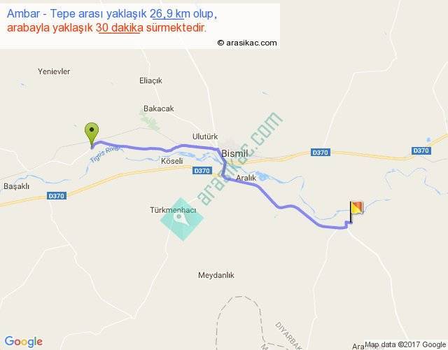 Ambar - Tepe arası yaklaşık olarak 90 km/h ile yukarıda belirtilen sürede olup, iki yerin kuş uçuşu uzaklığı (mesafesi) 23'dir. Yolculuk otobüsle 39 dakika sürmektedir.