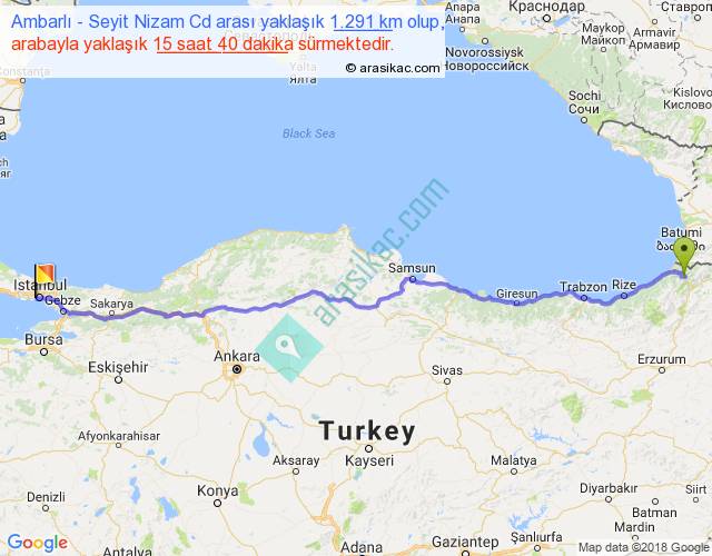 Ambarlı - Seyit Nizam Cd arası yaklaşık olarak 90 km/h ile yukarıda belirtilen sürede olup, iki yerin kuş uçuşu uzaklığı (mesafesi) 1065'dir. Eğer belirtilen yerler arasında uçak seferi var ise bu süre uçakla 1 saat 38 dakika'ya kadar düşebilir. Yolculuk otobüsle 20 saat 22 dakika sürmektedir.