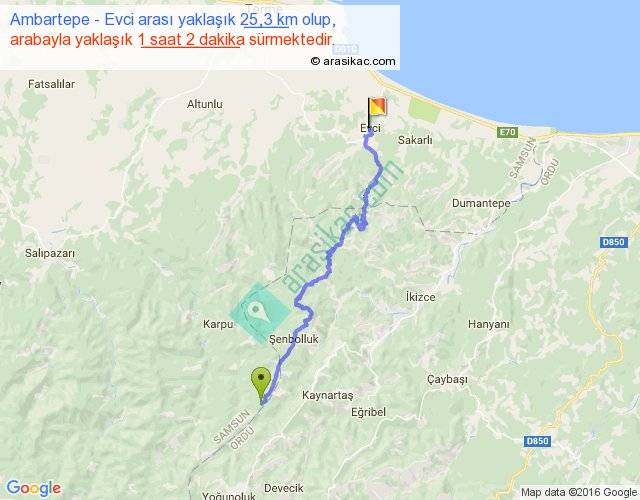Ambartepe - Evci arası yaklaşık olarak 90 km/h ile yukarıda belirtilen sürede olup, iki yerin kuş uçuşu uzaklığı (mesafesi) 17'dir. Yolculuk otobüsle 1 saat 20 dakika sürmektedir.