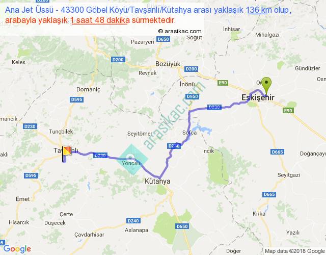 Ana Jet Üssü - 43300 Göbel Köyü Tavşanlı Kütahya arası yaklaşık olarak 90 km/h ile yukarıda belirtilen sürede olup, iki yerin kuş uçuşu uzaklığı (mesafesi) 98'dir. Yolculuk otobüsle 2 saat 20 dakika sürmektedir.
