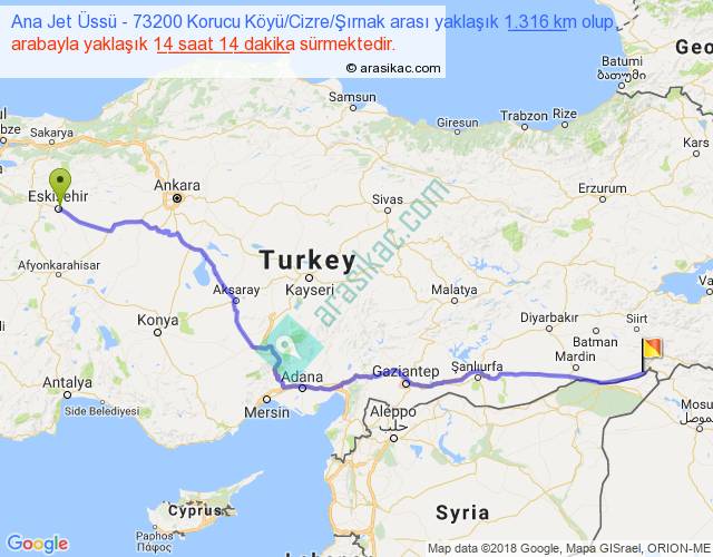 Ana Jet Üssü - 73200 Korucu Köyü Cizre Şırnak arası yaklaşık olarak 90 km/h ile yukarıda belirtilen sürede olup, iki yerin kuş uçuşu uzaklığı (mesafesi) 1032'dir. Eğer belirtilen yerler arasında uçak seferi var ise bu süre uçakla 1 saat 35 dakika'ya kadar düşebilir. Yolculuk otobüsle 18 saat 30 dakika sürmektedir.