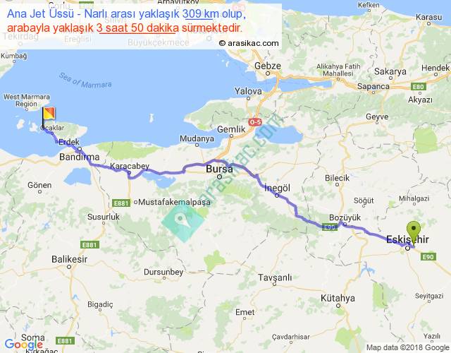 Ana Jet Üssü - Narlı arası yaklaşık olarak 90 km/h ile yukarıda belirtilen sürede olup, iki yerin kuş uçuşu uzaklığı (mesafesi) 256'dir. Eğer belirtilen yerler arasında uçak seferi var ise bu süre uçakla 23 dakika'ya kadar düşebilir. Yolculuk otobüsle 4 saat 59 dakika sürmektedir.