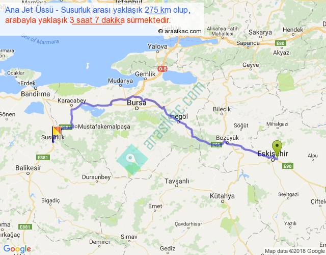 Ana Jet Üssü - Susurluk arası yaklaşık olarak 90 km/h ile yukarıda belirtilen sürede olup, iki yerin kuş uçuşu uzaklığı (mesafesi) 206'dir. Yolculuk otobüsle 4 saat 3 dakika sürmektedir.