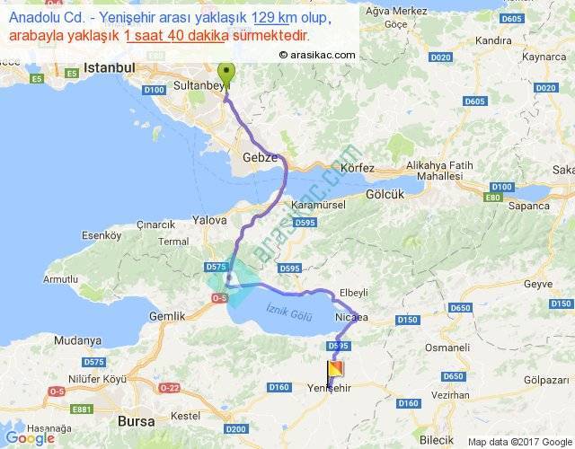Anadolu Cd. - Yenişehir arası yaklaşık olarak 90 km/h ile yukarıda belirtilen sürede olup, iki yerin kuş uçuşu uzaklığı (mesafesi) 80'dir. Yolculuk otobüsle 2 saat 10 dakika sürmektedir.