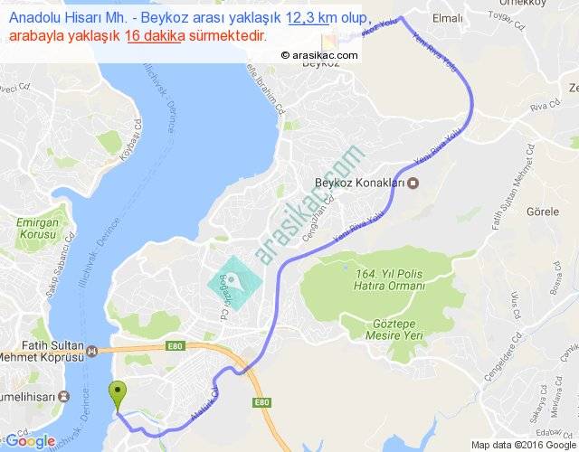 Anadolu Hisarı Mh. - Beykoz arası yaklaşık olarak 90 km/h ile yukarıda belirtilen sürede olup, iki yerin kuş uçuşu uzaklığı (mesafesi) 6'dir. Yolculuk otobüsle 20 dakika sürmektedir.