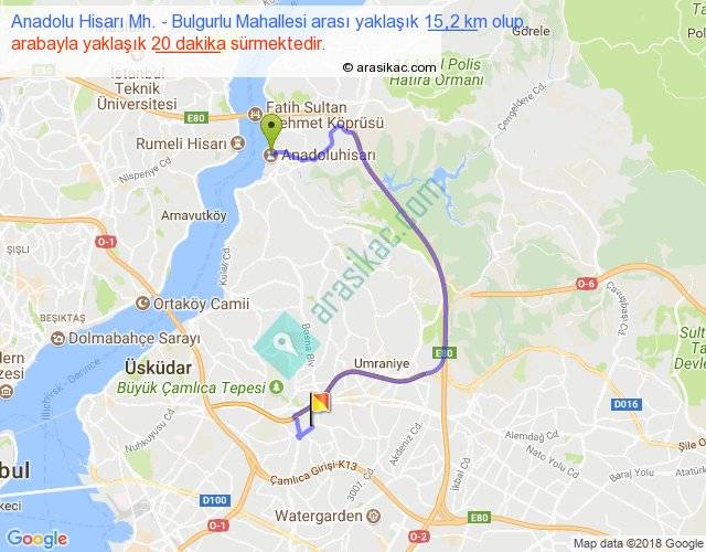 Anadolu Hisarı Mh. - Bulgurlu Mahallesi arası yaklaşık olarak 90 km/h ile yukarıda belirtilen sürede olup, iki yerin kuş uçuşu uzaklığı (mesafesi) 7'dir. Yolculuk otobüsle 26 dakika sürmektedir.